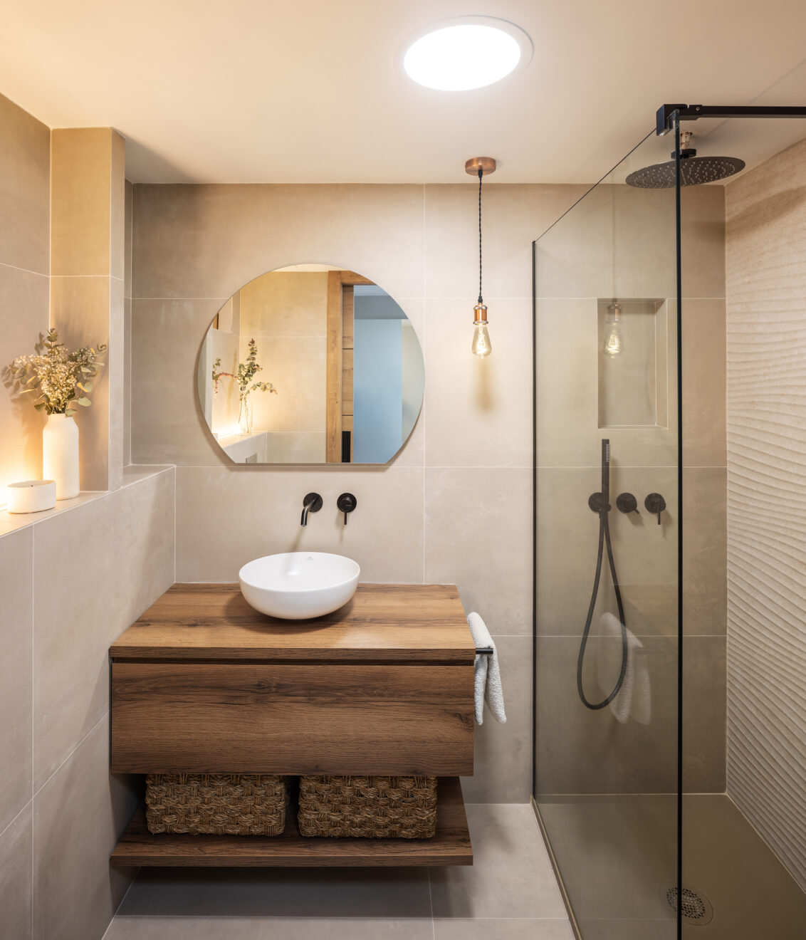 Una nova distribució i materialitat pel bany de l’apartament superior. Amb els tons terrosos es crea un espai agradable i recollit. Foto: Judith Casas