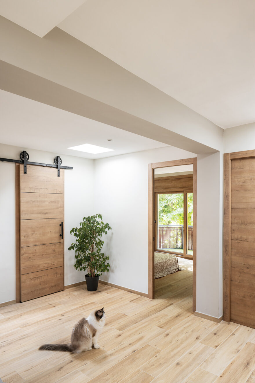 La planta segona contenia el programa de nit (els dormitoris i un bany). Calia una sala d’estar, una cuina i almenys un dormitori gran per convertir-se en un apartament autònom. Vam introduir instal·lacions noves per la cuina i vam reutilitzar les existents pel bany. L’eliminació de l’habitació central ens va permetre crear un gran espai polivalent al centre que fa de sala d’estar i de distribuidor. Un dels dormitoris va passar a ser la cuina, que dona a la part posterior. Els dormitoris estan orientats a la Riera, amb llum d’est.