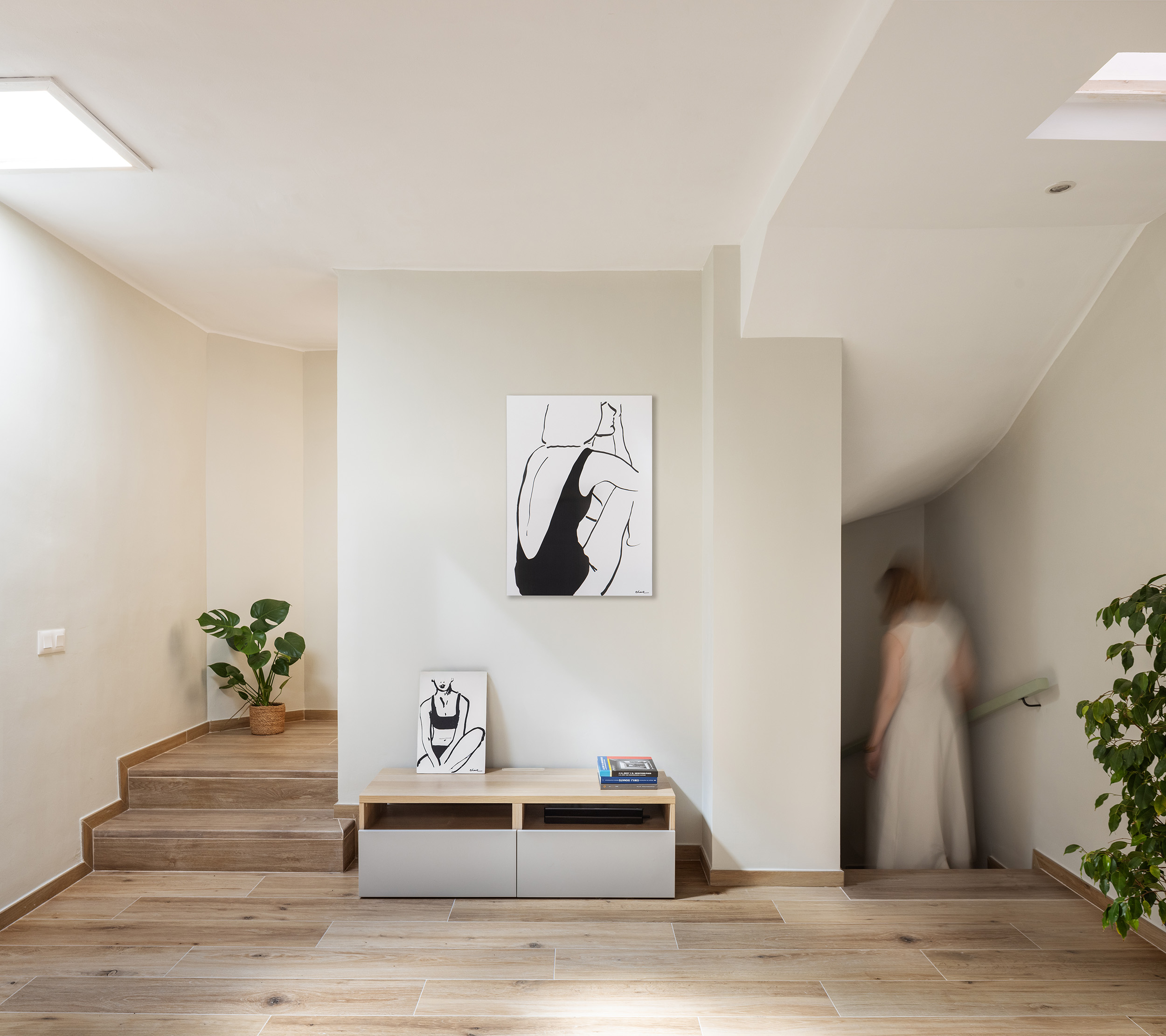 L’escala es converteix en una peça clau. Ara, el primer tram és comunitari, mentre que el segon dona accés exclusiu al dúplex superior. Les instal·lacions es disposen en vertical per optimitzar el funcionament i la intervenció.