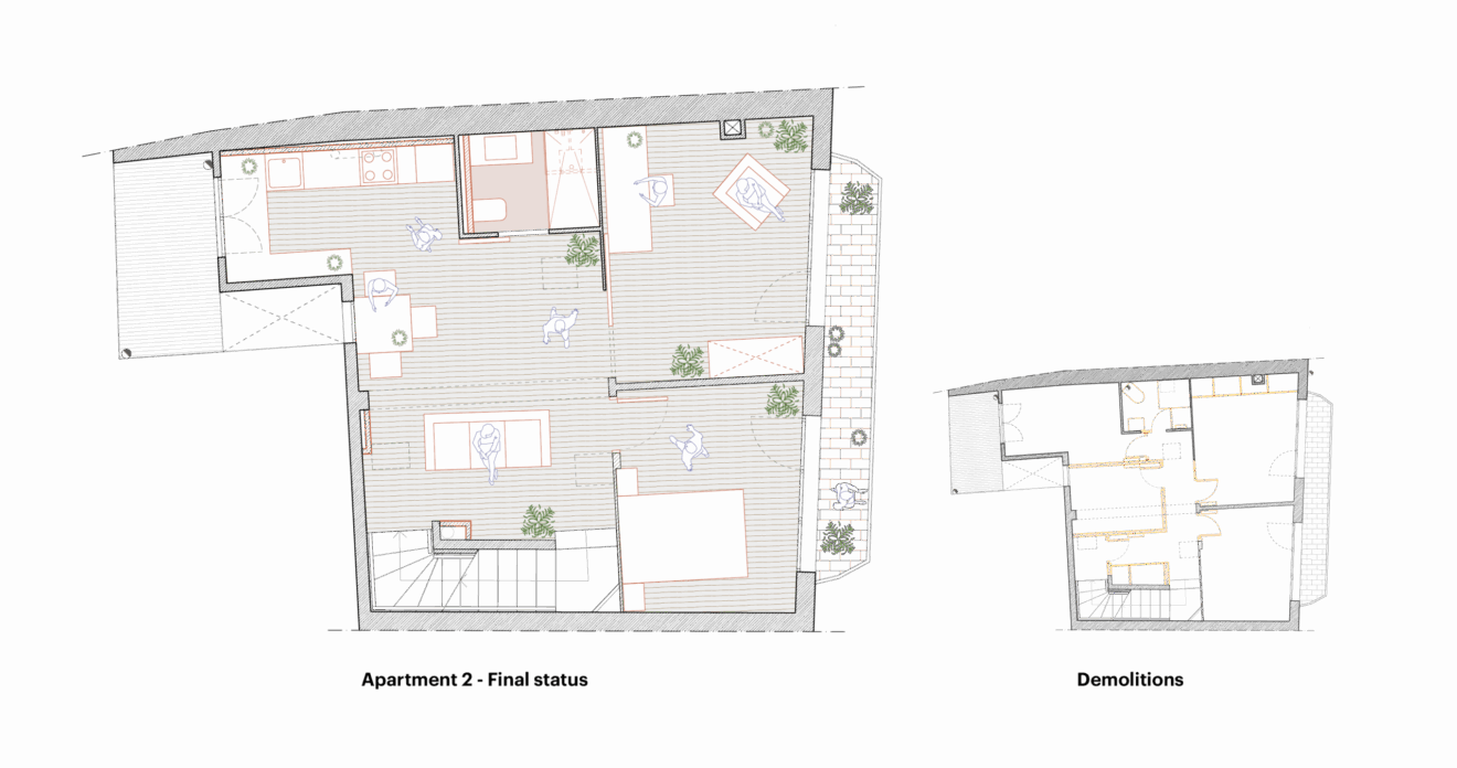 Finalment, vam aconseguir un apartament a la primera planta, de 65 m2, i un altre a la segona planta, un tríplex amb escala pròpia i terrat, de 112 m2.