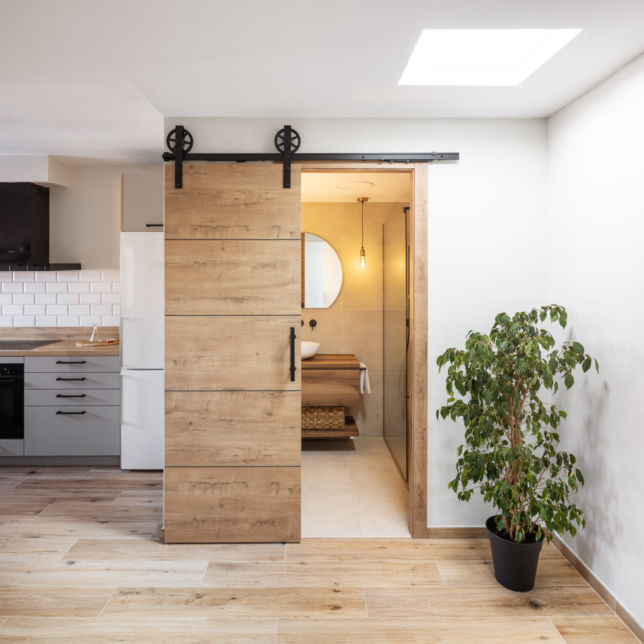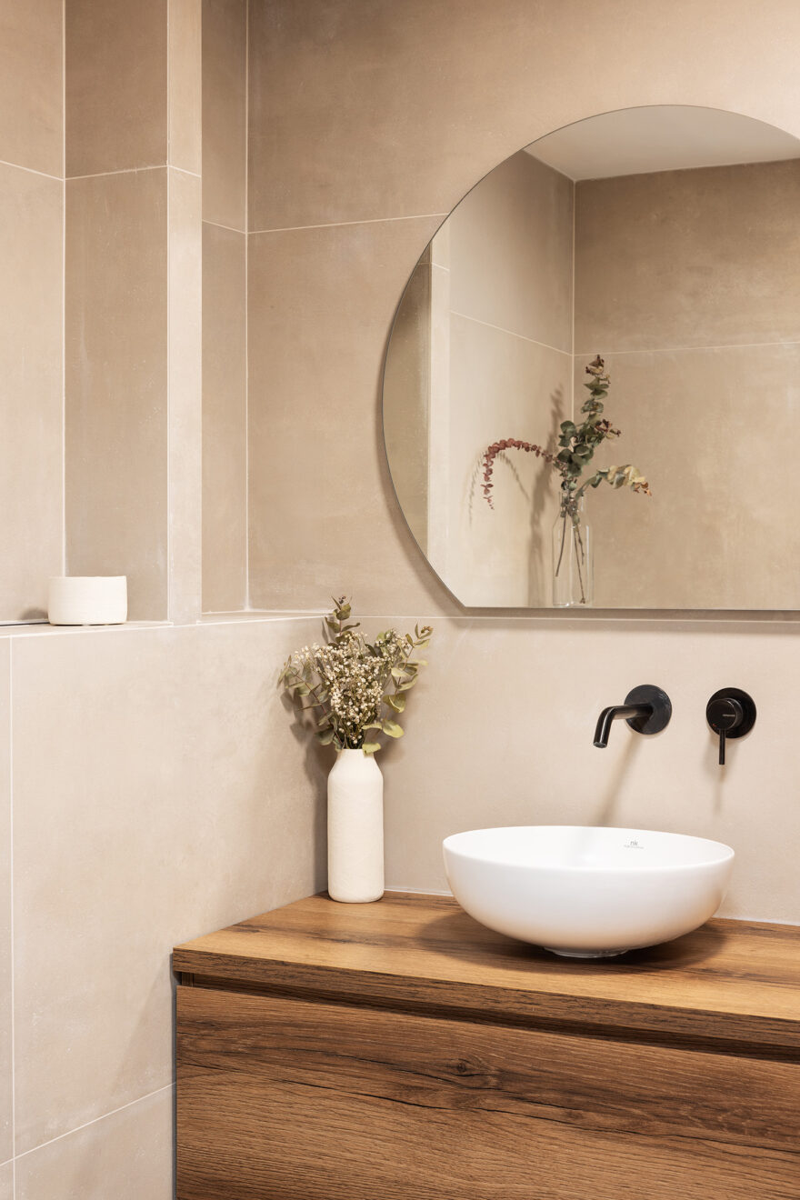 Una nova distribució i materialitat pel bany de l’apartament superior. Amb els tons terrosos es crea un espai agradable i recollit. Foto: Judith Casas