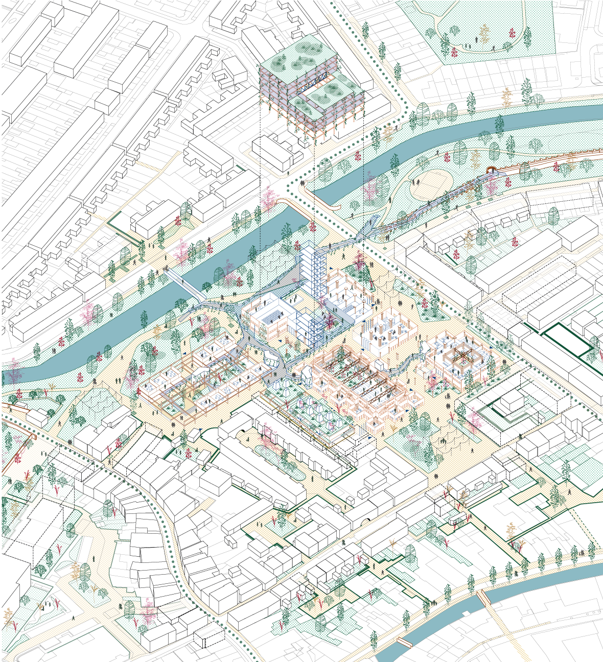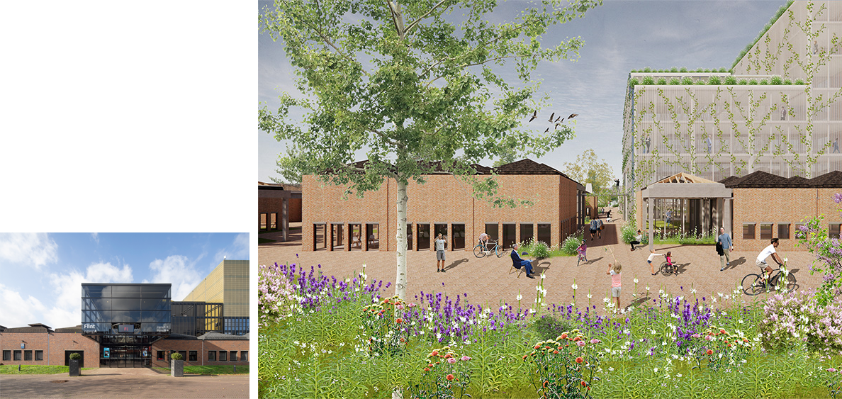 La proposta aborda els reptes mitjançant la connectivitat, la materialitat i la sostenibilitat a les escales de ciutat, barri i edifici. El seu lema, “Open Show”, reflecteix una visió inclusiva: “Open”, per l’accessibilitat i els espais acollidors; “Show”, per celebrar la vida dins del Flint, convertint les activitats quotidianes de les persones, la natura i els animals en una actuació dinàmica que enriqueix la comunitat i redefineix el paper social i ambiental de l’edifici.