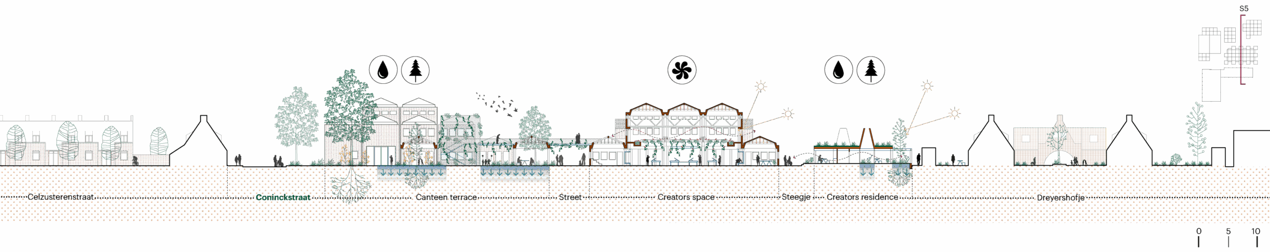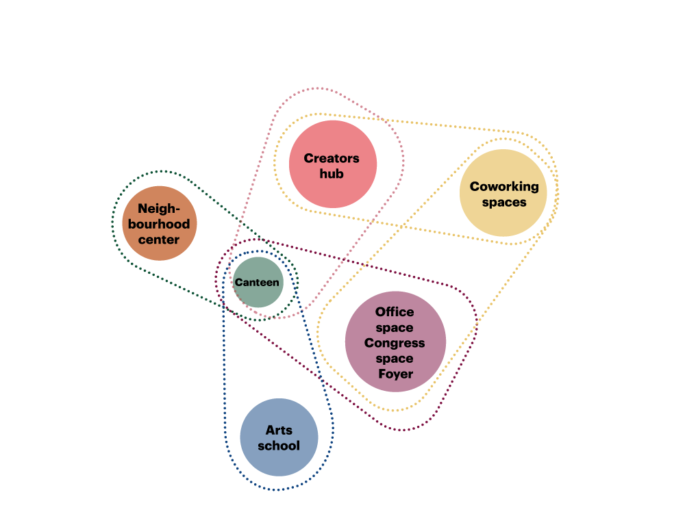 Tot i estar format per programes diferenciats —com el vestíbul, la cantina, el centre de barri, el coworking i els espais creatius—, la proposta imagina un programa flexible, adaptable i interconnectat, en què cada element complementa els altres.